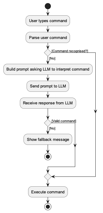 The key idea is that the LLM is only invoked as a fallback when the traditional parser cannot understand the user command. This keeps exact commands fast and predictable, while natural language input is handled by the LLM.